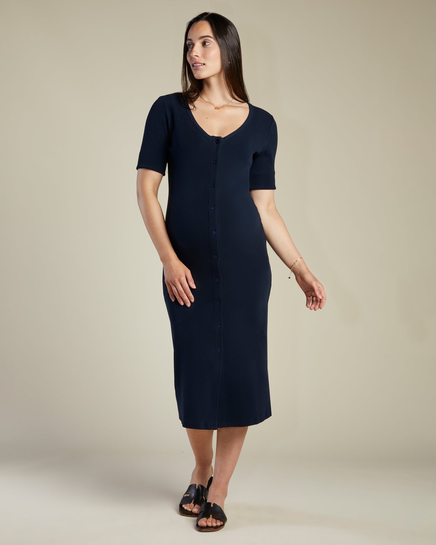 The Nurture Short Sleeve Button Down Midi Dress features a stretchy, body-hugging knit that adapts beautifully to your growing bump. A cap sleeve and midi slit add subtle femininity to this classic silhouette. It's effortlessly flattering and ideal for day-to-night transitions and adaptable for nursing needs.